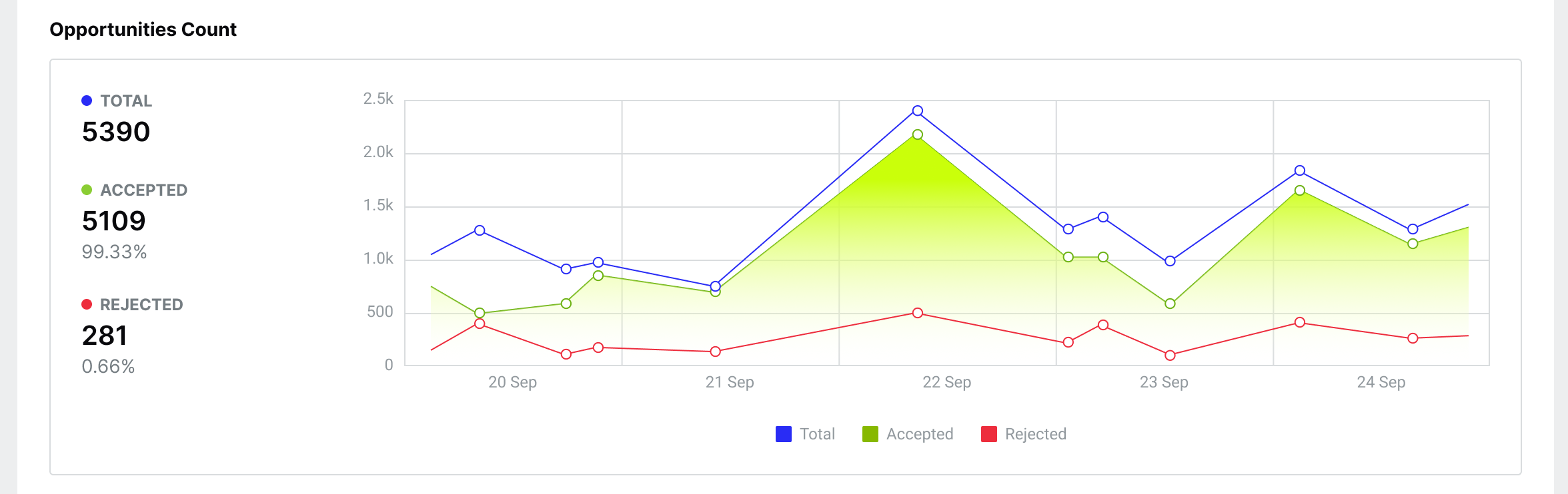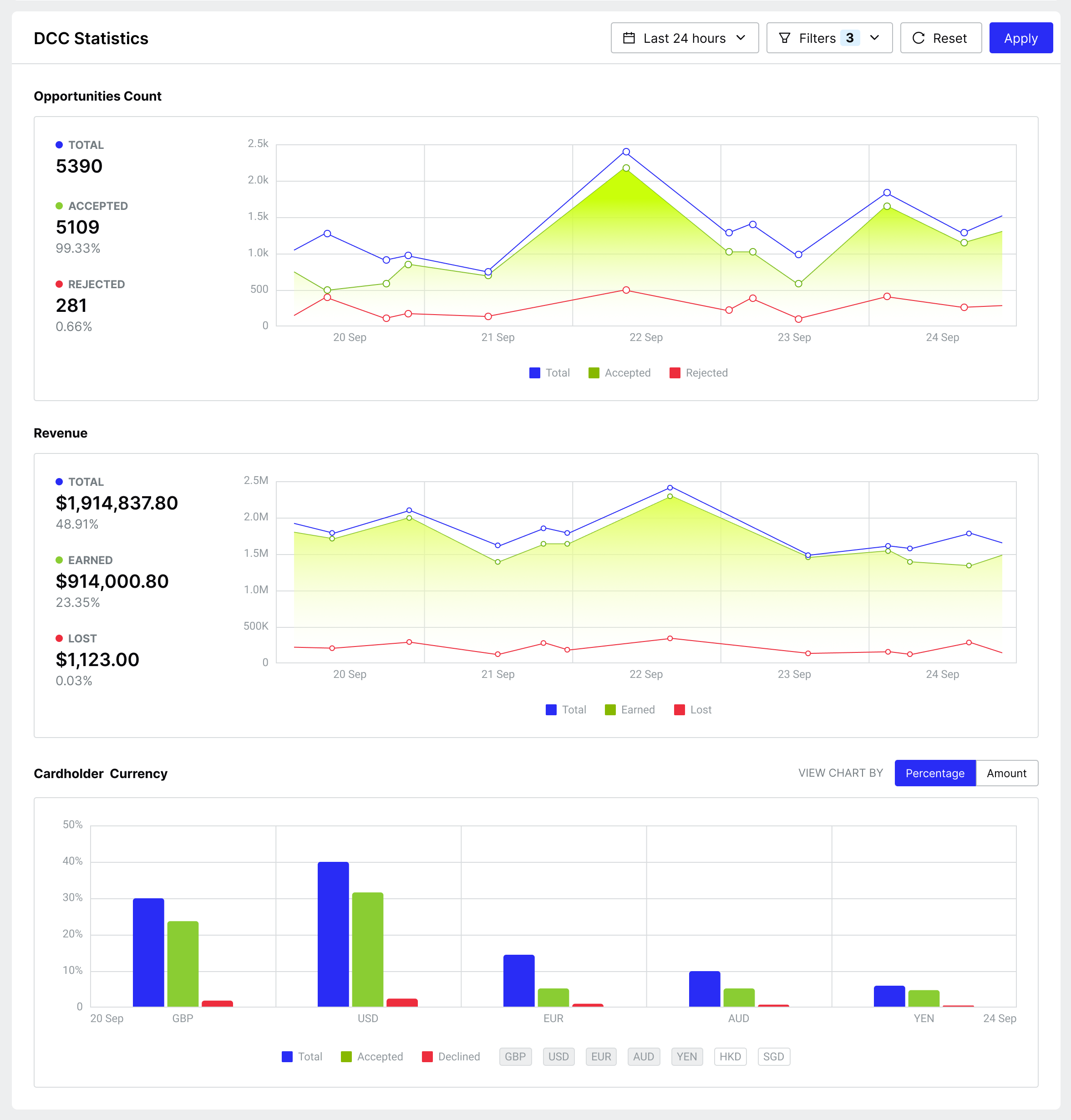 - Accepted opportunities: Transaction requests where the customer accepted the DCC rate, indicated by the DCC indicator.
