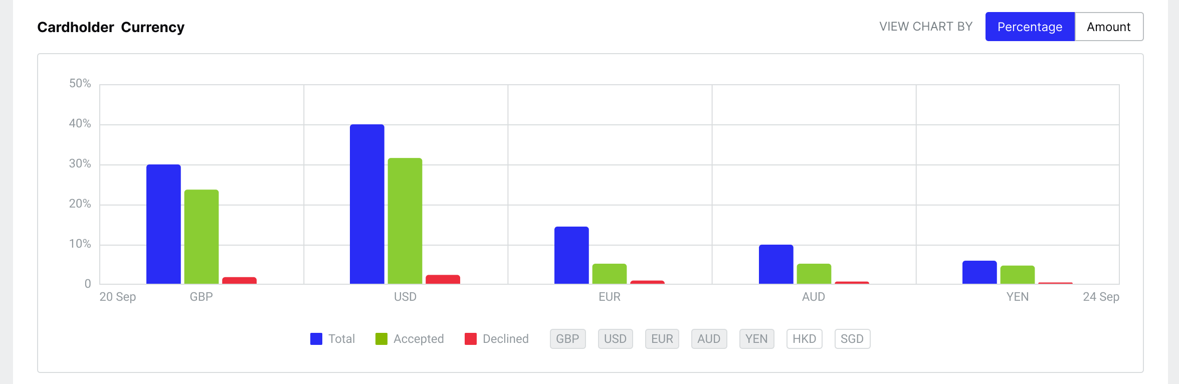 The Cardholder Currency widget allows you to understand which currencies your customers use and how they respond to DCC offers. This information helps you track where your customers are based and identify which currencies generate the most DCC opportunities.