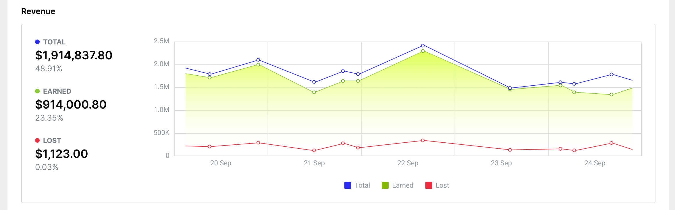 - Revenue lost: The potential revenue from transactions where customers rejected the DCC rate or where the transaction was declined. This accumulates the markup percentage amount that could have been earned converted in your local currency.