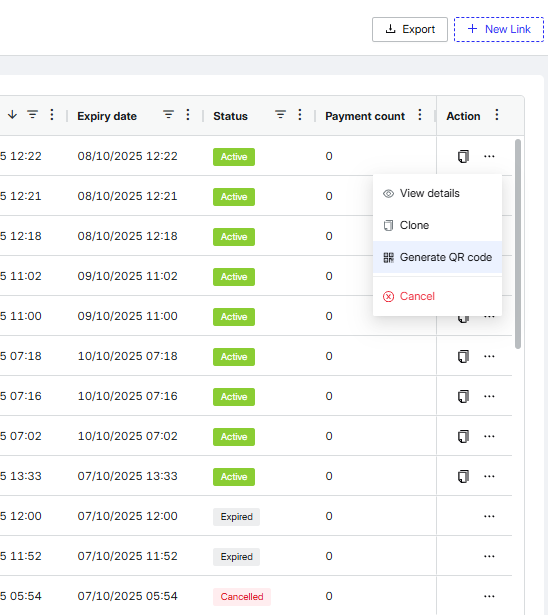 In the Action column, click the copy icon () to copy the URL or click ... > Generate QR code to create a QR code that you can either download or copy.