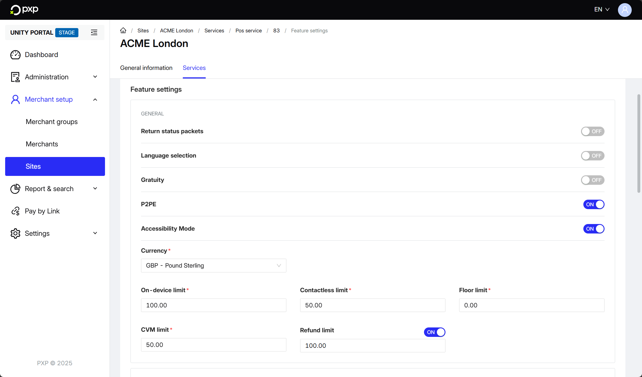 - Select the site associated with the device for which you want to set up a refund limit.